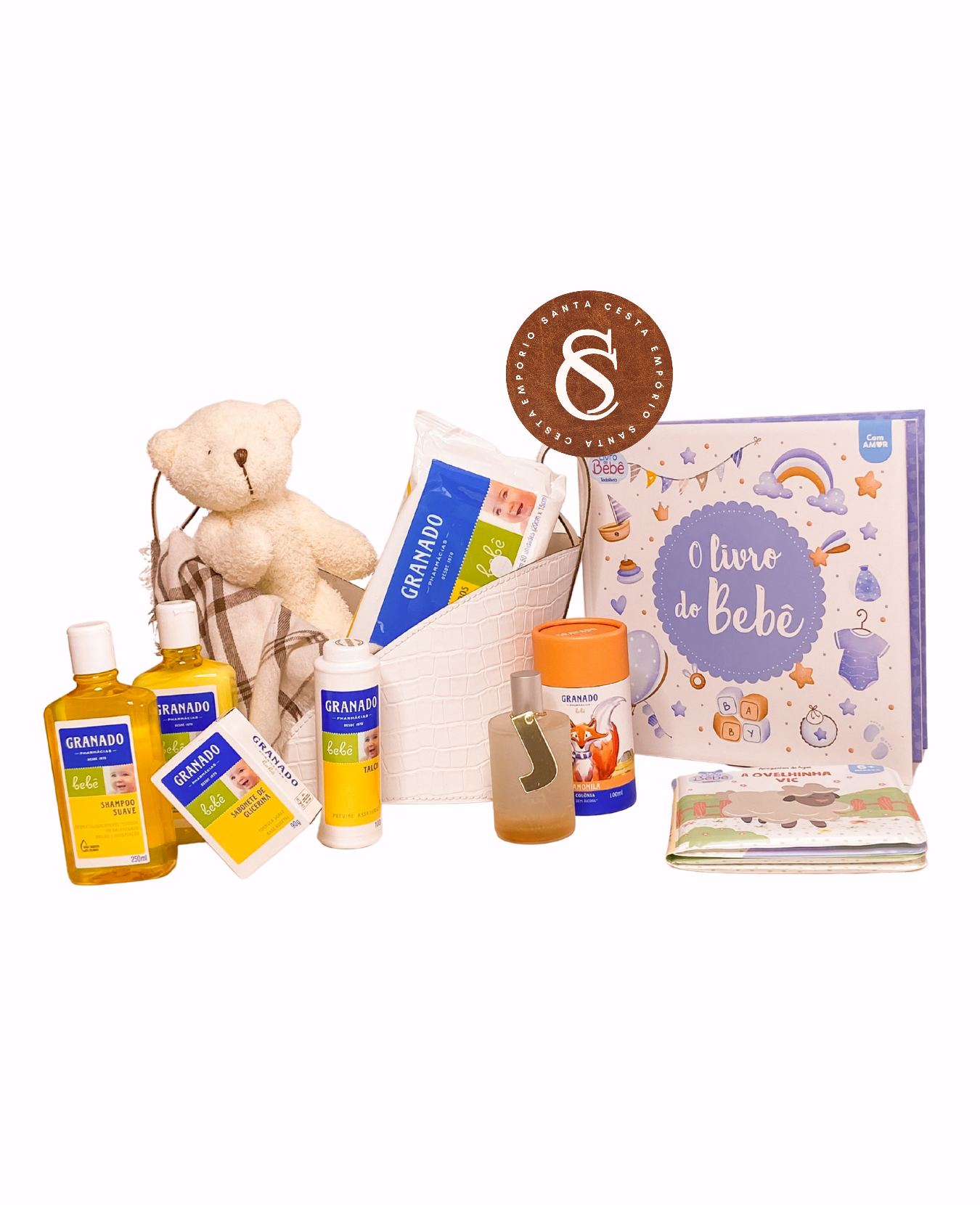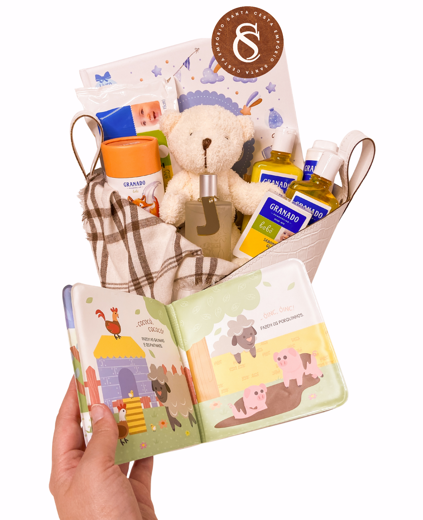 Cada item foi cuidadosamente selecionado para proporcionar momentos especiais, acolhimento e bem-estar ao bebê — tudo organizado em uma charmosa bolsa que continuará sendo útil no dia a dia.