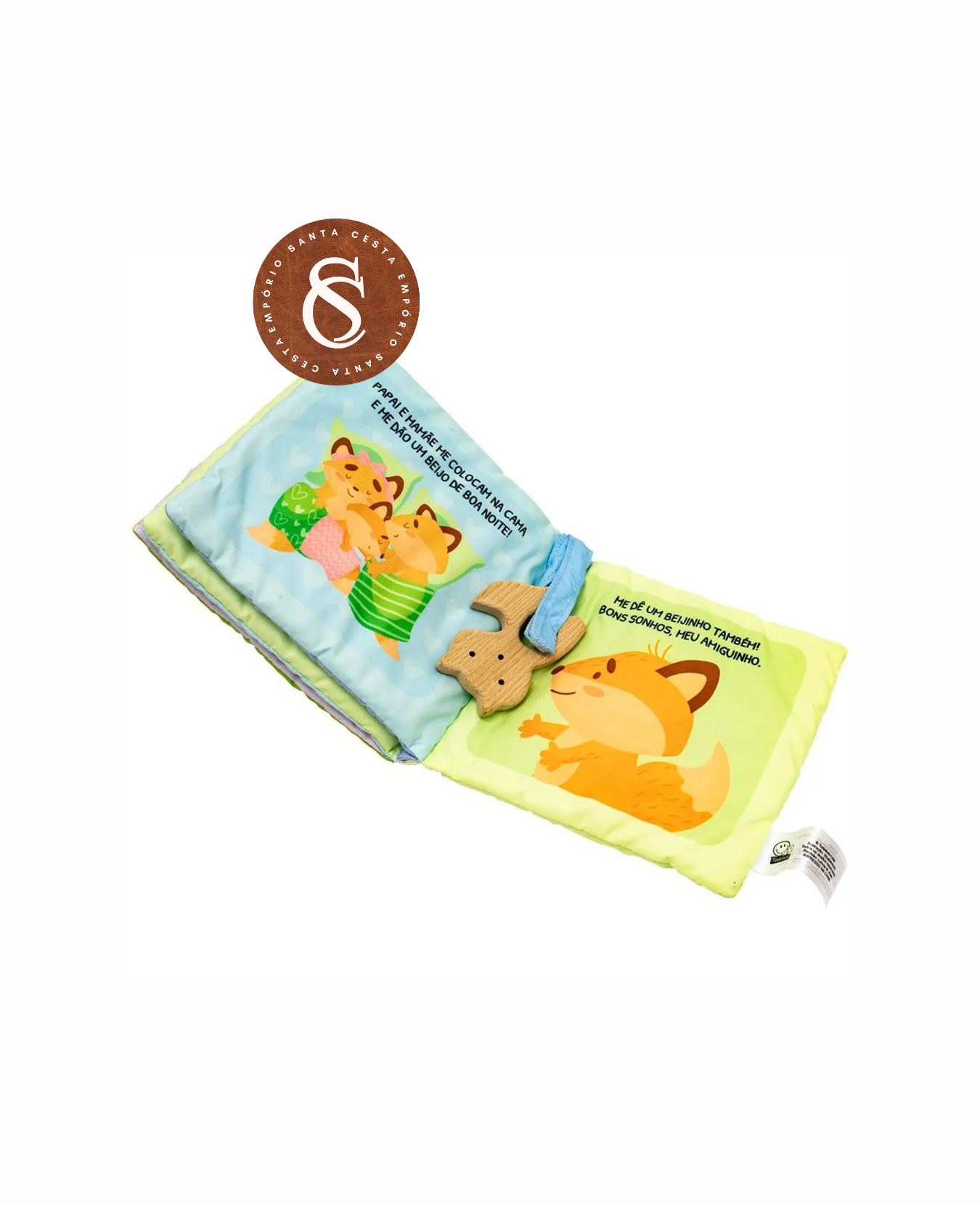 Acompanha um mordedor de madeira no formato do personagem com uma laça de fechamento em velcro, presa ao livro.