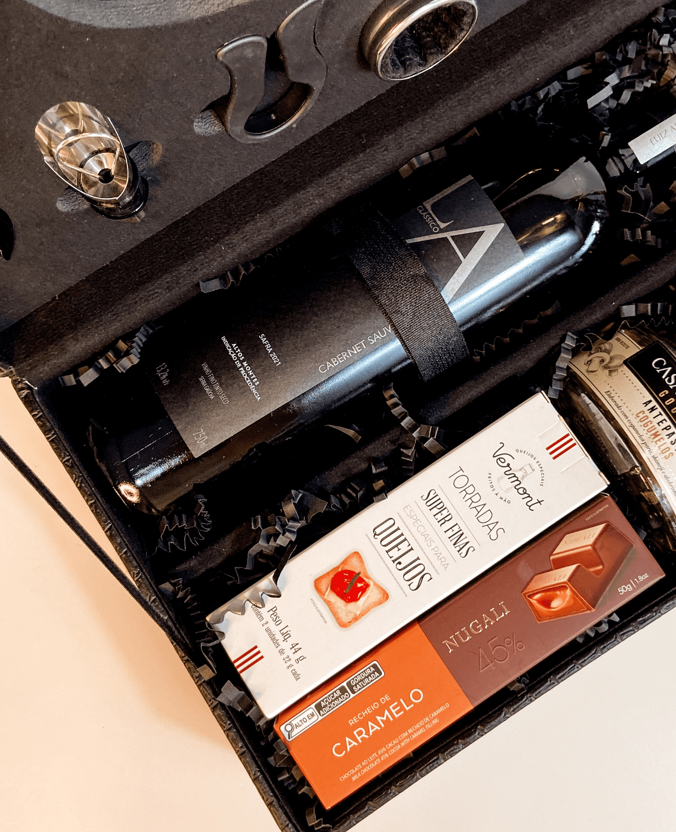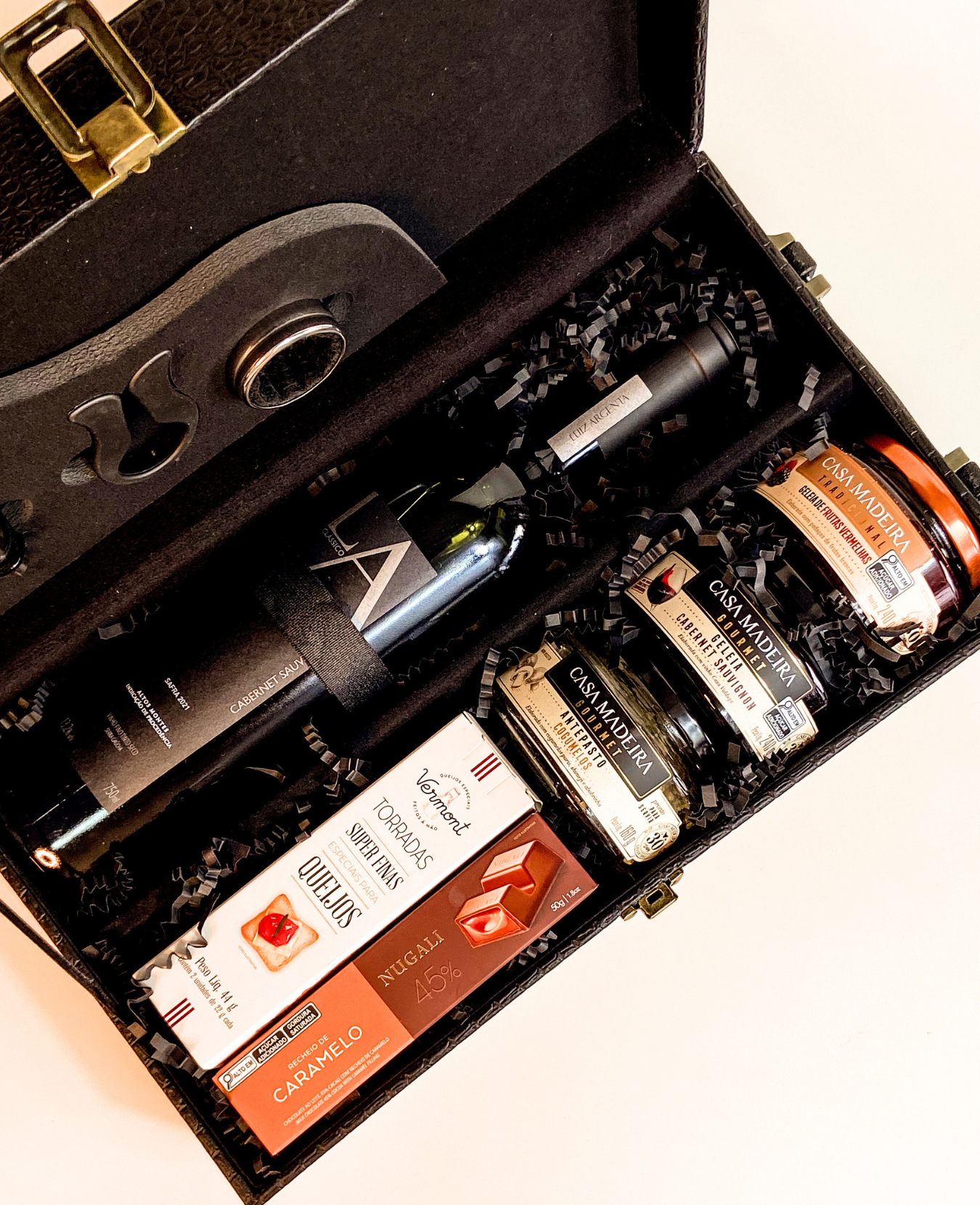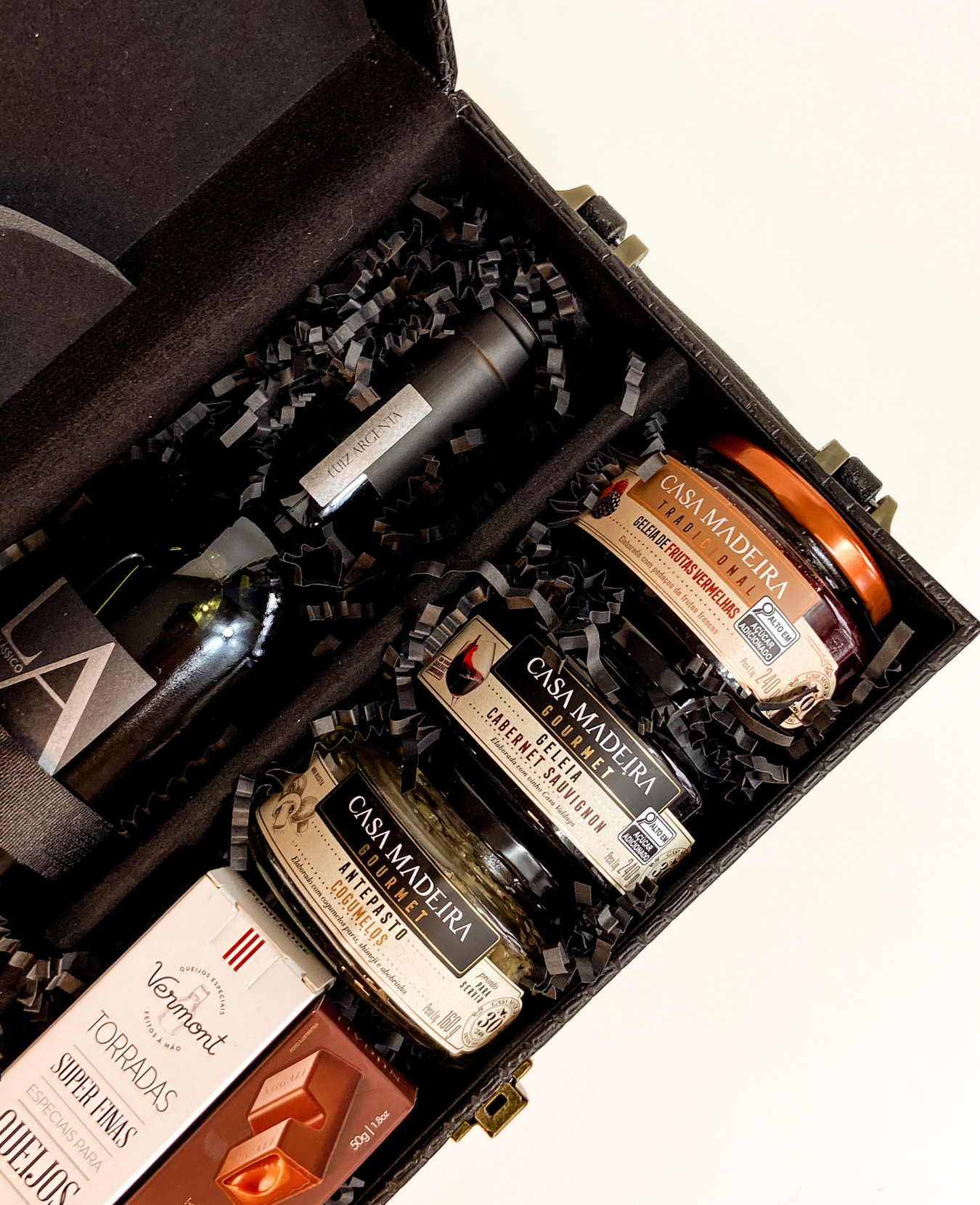 || maleta com kit vinho 4 peças || 1 bebida (a escolher) || geleia de cabernet sauvignon Casa Madeira 240g || antepasto de cogumelos Casa Madeira 160g || torradas superfinas Vermont 44g || geleia de frutas vermelhas Casa Madeira 240g || chocolate ao leite recheado com caramelo Nugali 50g || preenchimento com papel zig-zag || tag natalina com nome ||