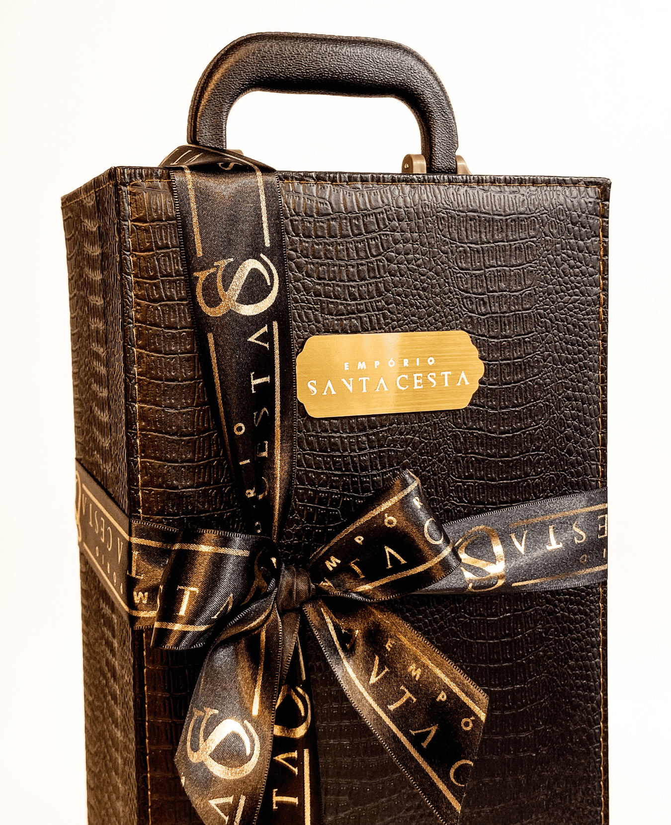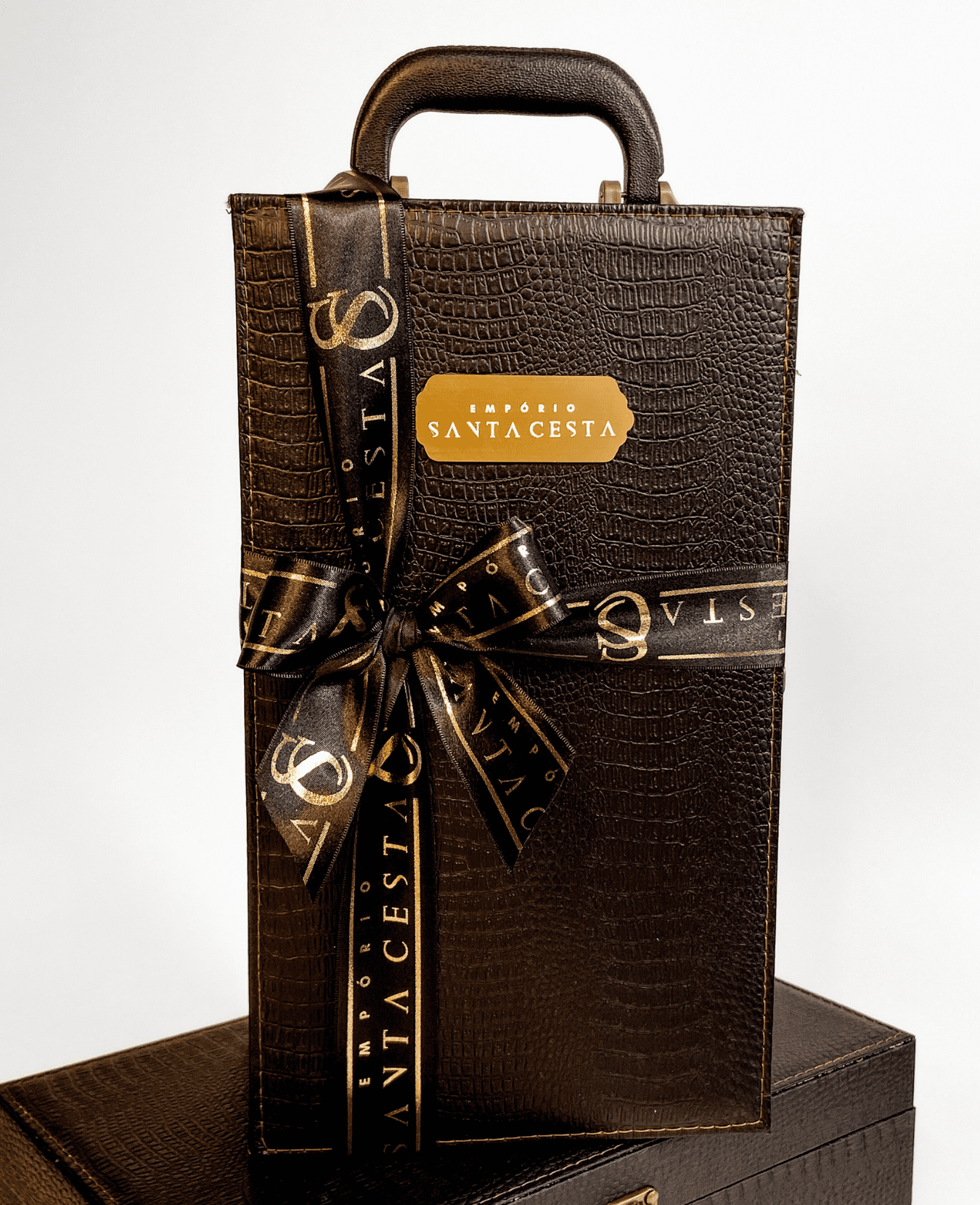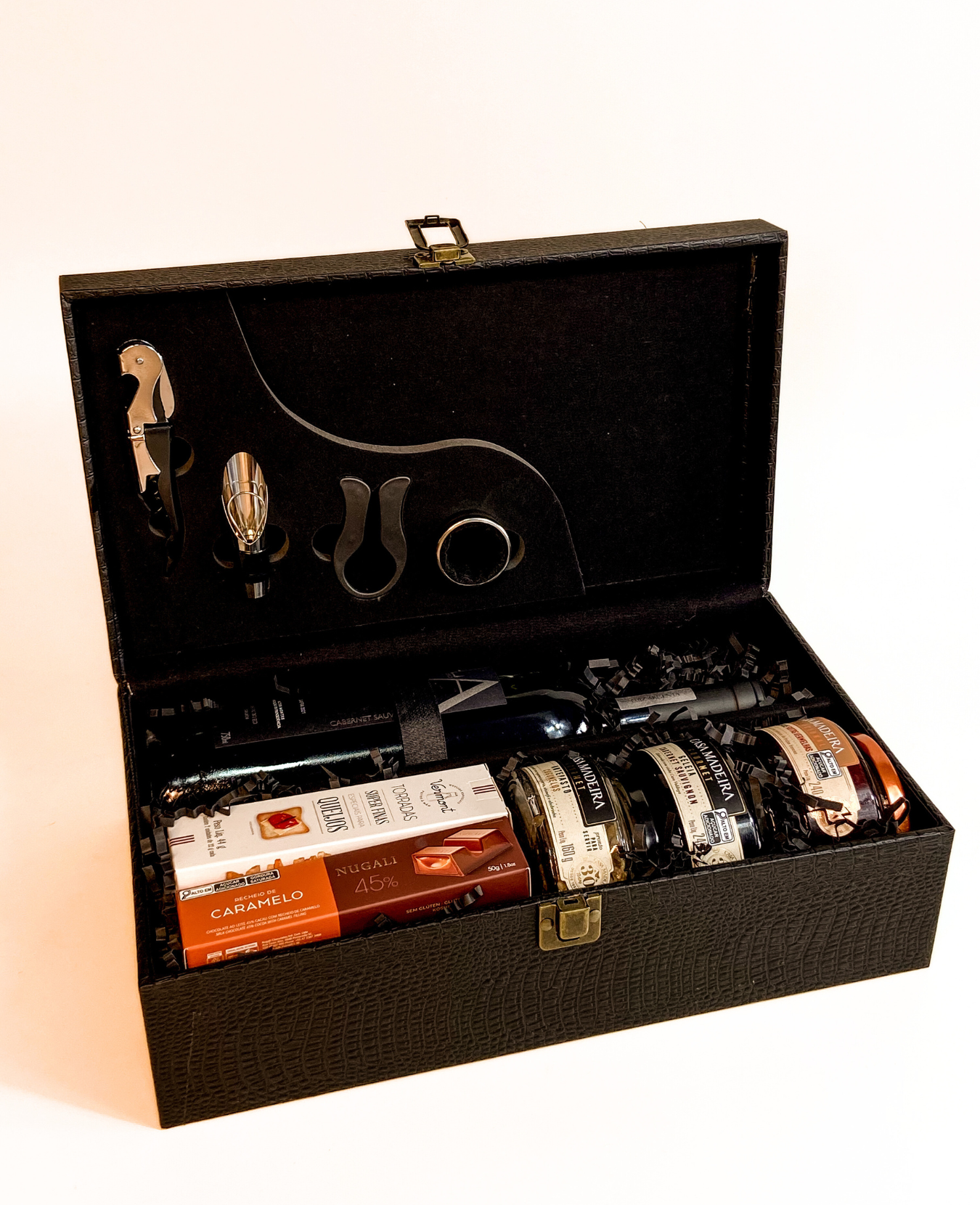 || maleta com kit vinho 4 peças || 1 bebida (a escolher) || geleia de cabernet sauvignon Casa Madeira 240g || antepasto de cogumelos Casa Madeira 160g || torradas superfinas Vermont 44g || geleia de frutas vermelhas Casa Madeira 240g || chocolate ao leite recheado com caramelo Nugali 50g || preenchimento com papel zig-zag || tag natalina com nome ||