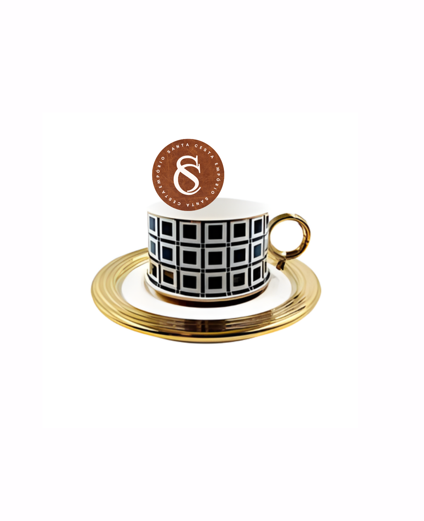 1 xícara de café 100ml preto e branco com pires branco e dourado.
